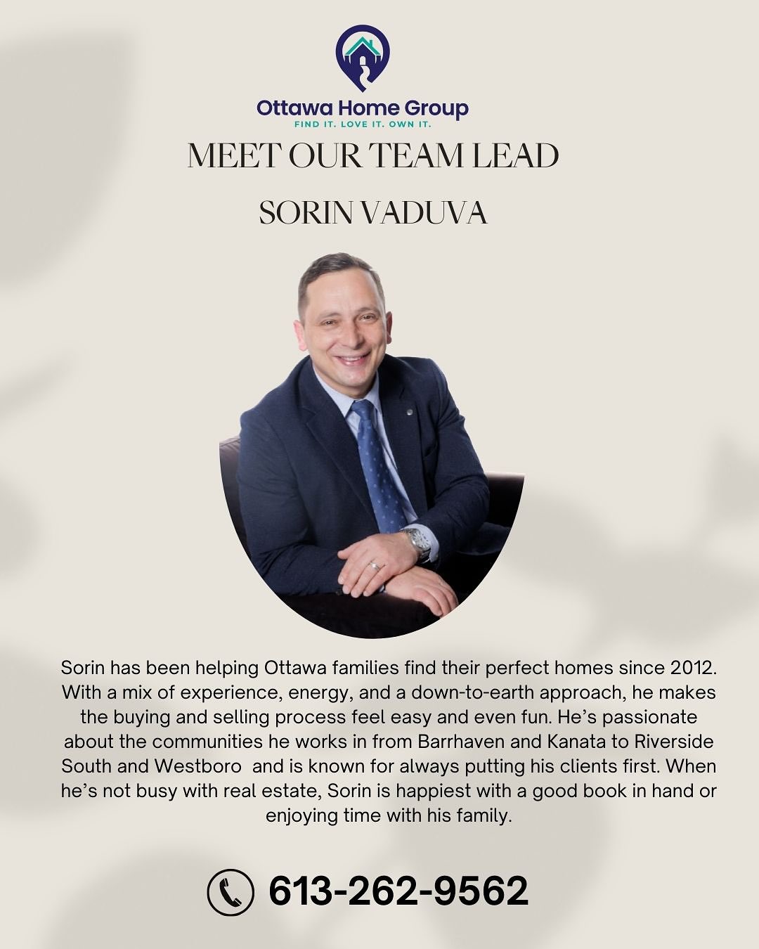 Helping Ottawa families since 2012, Sorin leads the team with energy, local knowledge, and a client-first mindset. He specializes in areas across the city, from Barrhaven and Kanata to Riverside South and Westboro.