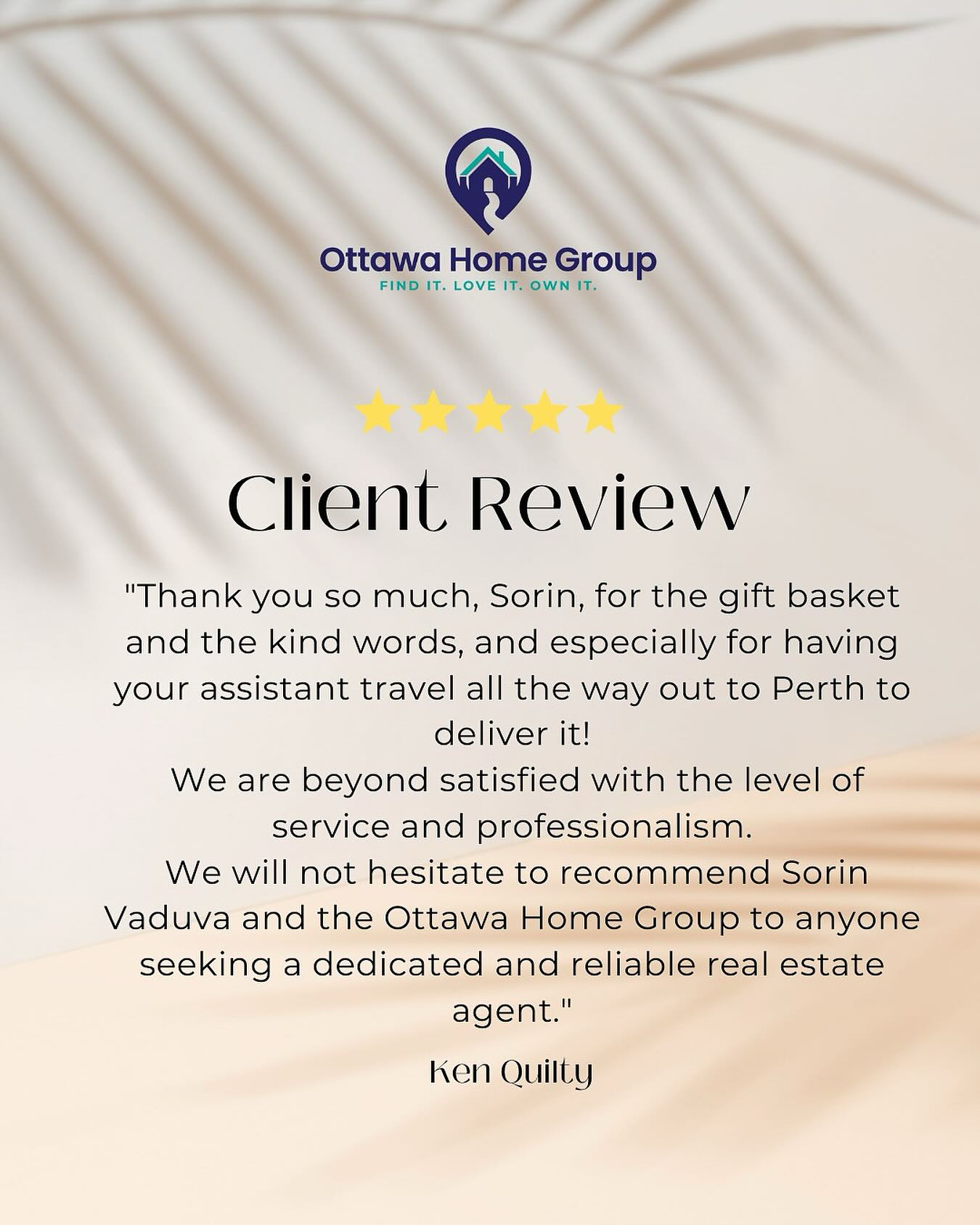 We are beyond satisfied with the level of service and professionalism. We will not hesitate to recommend Sorin Vaduva and the Ottawa Home Group to anyone seeking a dedicated and reliable real estate agent.”